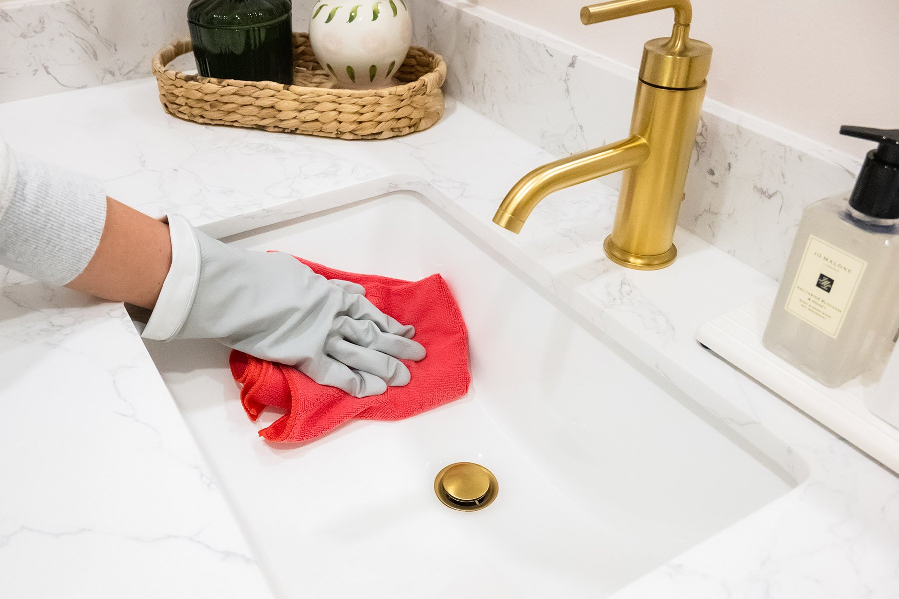 Puedes usar vinagre + agua + unas gotas de jabón de platos, pero si tu grifería es dorada o especial, usa un producto adecuado para no dañarla.